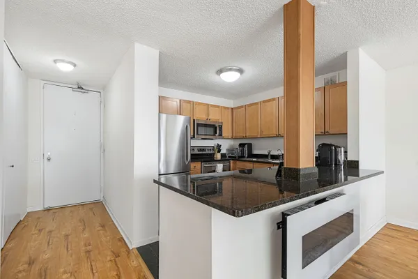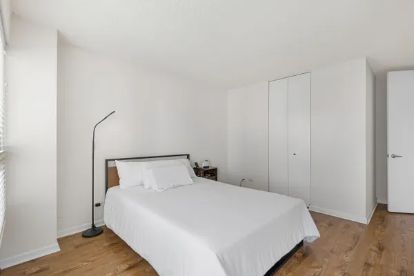 Check out this stunning 1-bedroom, 1-bath condo in the heart of River North! Enjoy abundant natural sunlight, an open-concept layout, and breathtaking city views. The kitchen features granite countertops, a convenient eat-in breakfast bar, stainless steel appliances, and a wine fridge - perfect for entertaining. The spacious living room is bright and inviting with beautiful vinyl plank flooring throughout. The large bedroom offers a walk-in closet, and the bathroom includes a tub/shower combo. This full-amenity building offers a 24-hour doorman, fitness center, pool, rooftop deck with grills and lounge area, business center, coin laundry, and extra storage. Just steps to express buses, the Red Line, Michigan Avenue, and the lakefront. Garage parking available for an additional $30,000. Investor-friendly building with no rental cap!