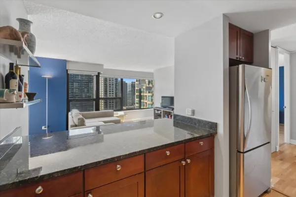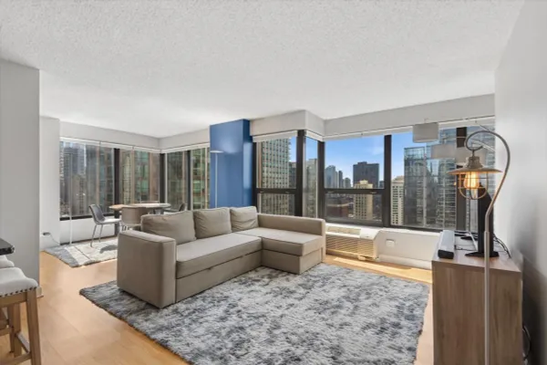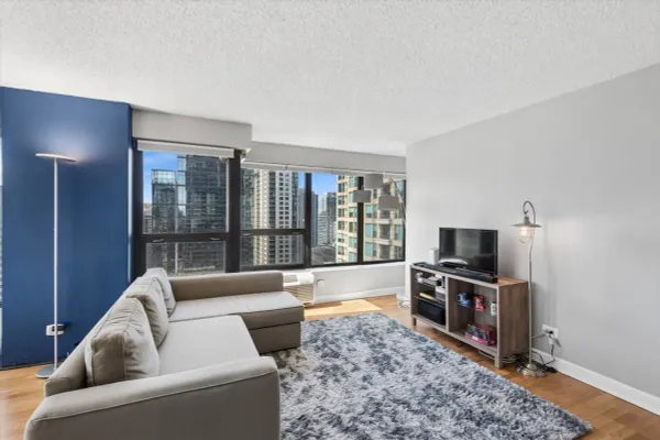 Stunning, Always Sunny SOUTH WEST Corner 2 Bedroom, 1 Bathroom Condo in the Heart of River North. Open Floor Plan Concept with a Split Bedroom Layout and Hardwood Flooring Throughout. In the Heart of the Condo Sits the Updated Kitchen with 42" Shaker Style Cabinetry, Stainless Steel Appliances, Granite Counters with a Huge Breakfast Bar Open to the Living and Dining Rooms. Spacious Living Room with Breathtaking 180 Wrap Around City Views that are Protected for the Foreseeable Future. Separate Dining Flows Seamlessly Into the Living Room & Kitchen Space, Perfect for Entertaining. Oversized Primary Suite Spacious Enough to Fit a King Sized Bed, Large Dresser and Work From Home Office with a Wall of Closets. Spacious 2nd Bedroom with Glass French Doors & Staged with a Queen Sized Trundle Bed. Updated Bathroom with Shaker Style Vanity with Granite Counters, 2nd Vanity/Make-Up Vanity, Glass Shower Doors + Linen Closet for Additional Storage. Other Features In-Unit Laundry (Cannot Install if Not There), Custom Window Treatments Throughout and Deeded Parking Space for Additional $30k. Assessments Include Everything Except for Electric - Bulk Cable Package, High Speed Internet, Water & All Building Amenities. Outstanding Amenities Include 24-Hour Doorman, 2 Story Sundeck & Outdoor Pool, Comprehensive Gym, Biz Center, Movie Theater & Party Room. Fantastic River North Location with Everything Right Outside Your Front from The Mag Mile Shopping, to the Best Restaurants in the City & the Lakefront Path.